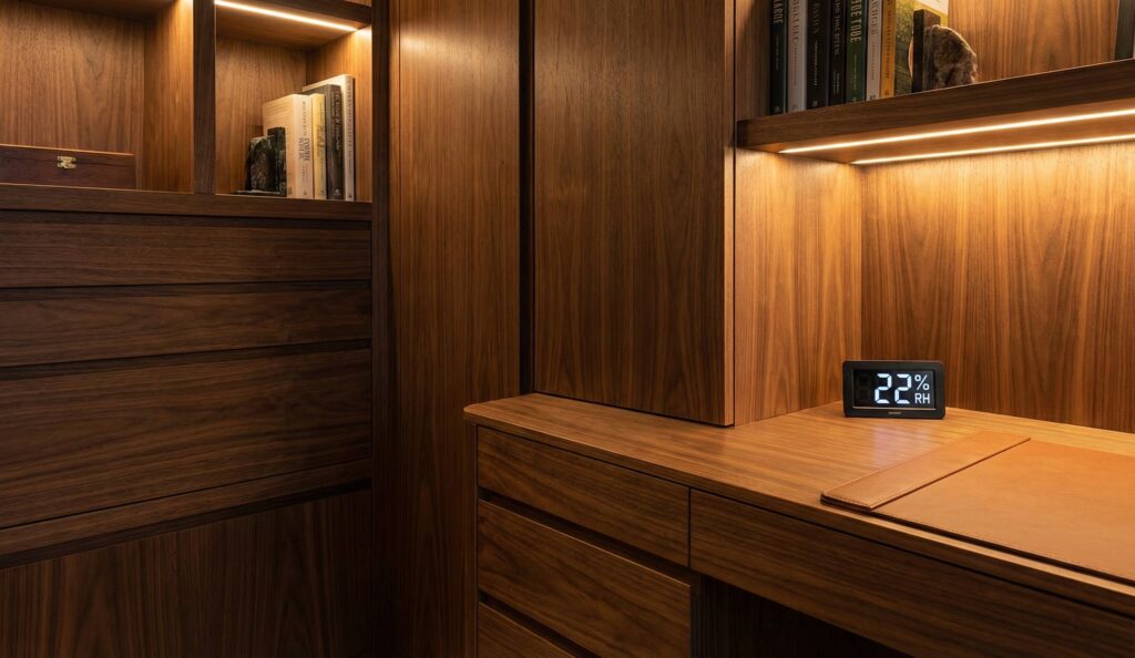 Wood movement is the leading cause of failure in arid interiors. Wood is hygroscopic; it gains or loses moisture to match the ambient RH. In climate-controlled interiors in Riyadh or Las Vegas, RH can drop below 20%, causing wood with standard moisture content (8-12%) to shrink, check, and warp.